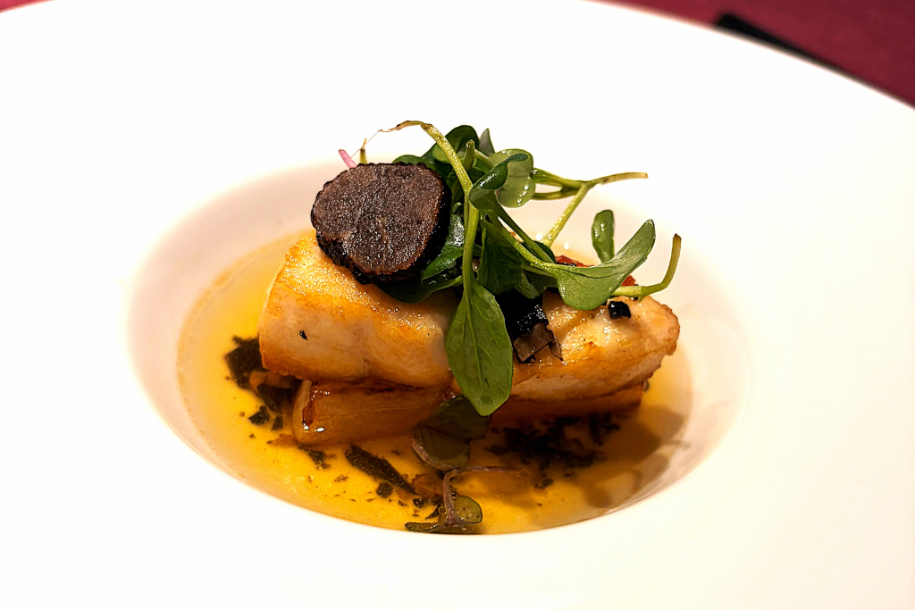 コースに新メニュー「希少・未経産近江牛のローストと気仙沼産フカヒレの姿焼き~菜園風野菜添え~」が入りました。